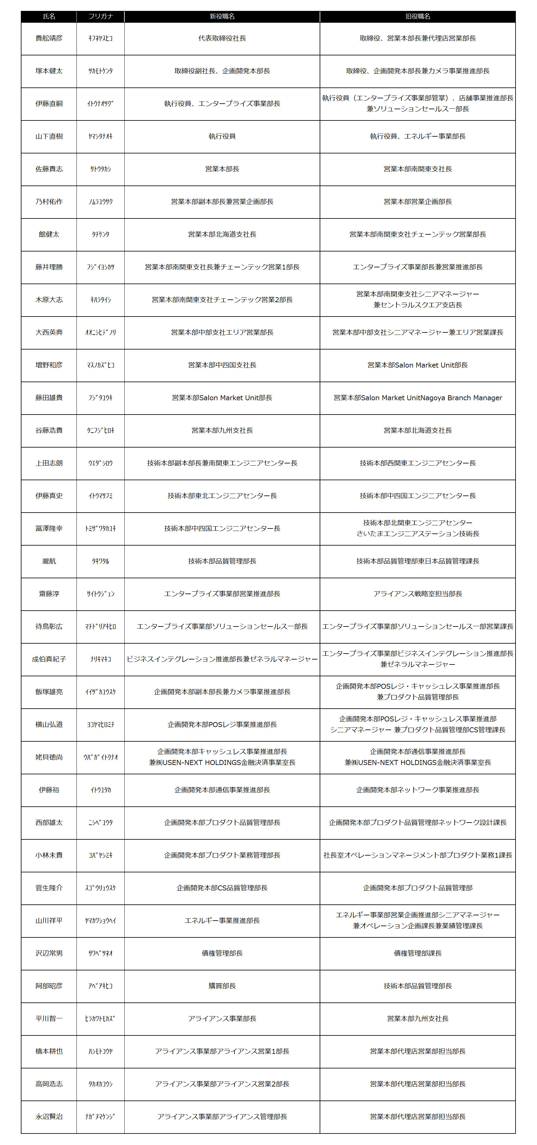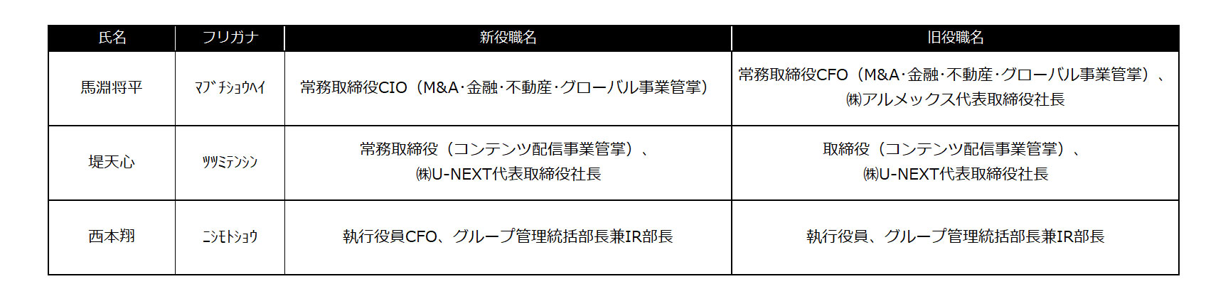 株式会社USEN-NEXT HOLDINGS(本社:東京都品川区、代表取締役社長CEO:宇野 康秀)は、2023年9月1日付および11月29日付における、当社とグループ会社である株式会社USENおよび株式会社U-NEXTの人事を決定しましたので、下記のとおりお知らせします。