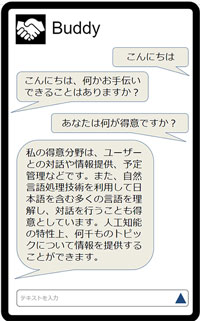 「Buddy」は、「Azure Open AI Service」の「GPT-4※4」を利用しており、指示や質問を入力すると会話形式で回答が生成されるため、業務をサポートするアシスタントとしての役割が期待できます。3つの種類(Web、チャット、表計算ソフト)から機能や用途に応じて、質疑応答、スライドのアウトライン作成、アイディア出し、コード作成など、幅広いタスクに活用できます。また今後、社員のニーズに応じて機能の改良・拡張も進めてまいります。