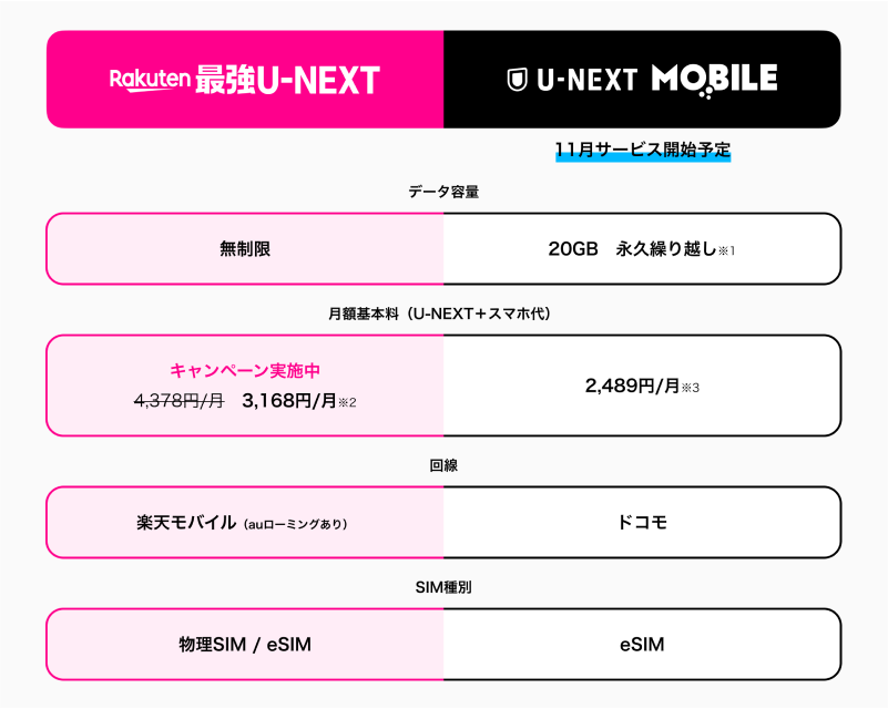 ※3:U-NEXTの月額プラン2,189円と「U-NEXT MOBILE」の月額基本料の合算金額です。