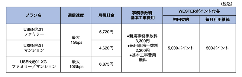 USEN NETWORKSが提供する個人向け光回線サービス「USEN光01」をご利用いただくことで、「WESTERポイント」が還元されるWESTER会員様限定のプランです。