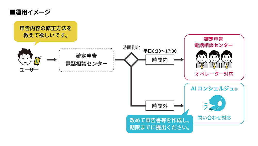 確定申告電話相談センターでは、確定申告に関する疑問やご相談に対し、オペレーターが有人で電話対応を行っていますが、対応時間は税務署の稼働時間内(平日8:30~17:00)に限られていました。こうした状況から、確定申告期間における電話相談の利便性向上に向け、24時間対応を実現するべく、今回『AIコンシェルジュⓇ』を提供する運びとなりました。