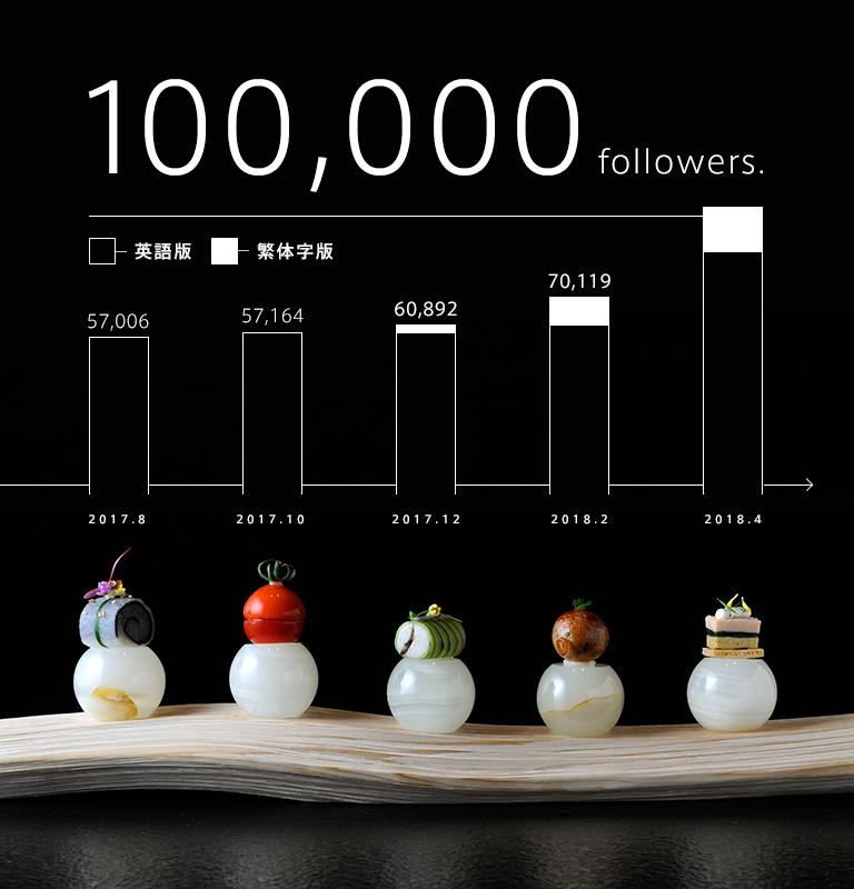 Facebook公式ページは英語版・繁体字版で展開しており、海外のFacebookユーザーに向けて日本のレストランや食文化の魅力を発信しています。日本の食の「美しさ」、料理人の「艶」の伝わる記事が好評を得て、順調にフォロワー数を伸ばしてきました。2017年12月にアカウントを開設した繁体字版の伸びも大きく、おかげさまでこの度フォロワー数10万人を突破しました。訪日外国人向けのグルメ情報に特化したメディアのフォロワー数として業界上位の位置づけとなります。