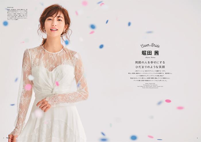 今号の表紙を飾るのは、モデルとして活躍する一方で、タレントしての才を発揮して、ますます人気上昇中の堀田茜さん。COVER BRIDEインタビューでは、ウェディングドレスを着た感想や、結婚式の夢も語っていただきました。