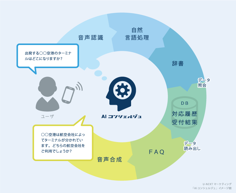 『AIコンシェルジュ』は、企業などのコールセンターにおける問い合わせ対応や商品の申し込み受付(受注)、販売などの業務をAIロボットが行うサービスです。ユーザーからの問い合わせについて、話した言葉の意図を解釈し、理解します。その内容に対し、業務毎に構築したFAQや蓄積した応対履歴のデータベースから回答を抽出し、AIが自動で適切な回答を音声合成や、ユーザーが希望すれば回答内容や参考となるURLをSMSで送信することが可能です。24時間365日稼働できるため、深夜や早朝など営業時間外の対応をAIに任せて、ユーザビリティ向上、サービス拡充に活用することもできます。これにより、有人による応対時間、待ち時間の短縮ができ、コールセンターの自動化・効率化に貢献します。