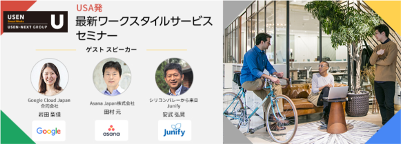 USEN-NEXT GROUPの株式会社 USEN Smart Works(本社:東京都品川区、代表取締役社長:大下 幸一郎、以下、当社)は、12月9日、Google Cloud Japan 合同会社、Asana Japan株式会社、Junify Corporation のUSA発の3社を招き、最新のワークスタイルサービスを紹介する無料セミナーを開催いたします。
