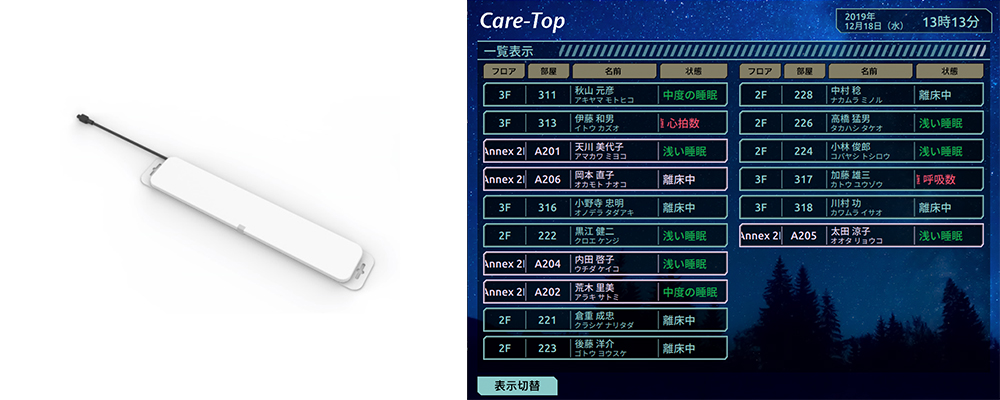 介護用みまもりシステム「Care-Top」は、最新の介護用ベッドセンサーと集中モニターを用いたもので、コンシューマー向け睡眠IoT製品をアップグレードしました。離床センサーやナースコール連動機能などが追加されています。クラウドまたはオンプレミスサーバーで心拍数・呼吸数・体動・睡眠の深さをリアルタイムでデータ解析し、集中モニターでは毎秒更新された情報を見ることができ、また、個人毎に設定されたアラート閾値に基づき、異常数値を検知した際には信号が点灯します。さらに睡眠傾向分析や行動分析ができるレポート機能により、管理者は個人の状態を把握し、対策をとることができます。