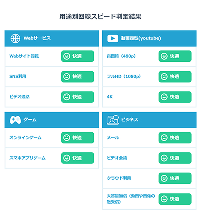 昨今、クラウドサービスの普及やリモートワークを導入する企業の増加により、インターネット上に流れるデータ量は爆発的に増えており、通信速度が低下する、あるいは回線に接続できなくなってしまう「輻輳(ふくそう)」と呼ばれる現象が起こりやすくなっています。ストレスフリーな通信環境を構築する一助として、現在の通信環境を評価する一基準としてご利用いただけます。