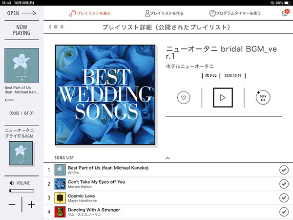 この取り組みでは、楽曲単位で選曲ができる音楽配信サービス 「OTORAKU -音・楽- (オトラク)」の機能を活用し、ホテルニューオータニ様のご要望を踏まえたオリジナルプレイリストをプロデュースすることで、ウエディングゾーンの空間演出をサポートします。選曲にあたっては、コロナ渦の結婚式を悩むお客様が少しでも明るいイメージを抱けるよう、ポジティブなイメージを持つ楽曲を中心にセレクトしました。主役のお二人がご家族やご友人とともに、明るい未来と感動を分かち合うことができればという想いも込めています。(幅広いジャンルからLOVEやHAPPYをテーマに、ミドル~アップテンポの楽曲を集めました)※OTORAKUは、利用者自身が選曲してプレイリストを作成できるため、当社がオリジナルプレイリストを担当することは、業界初の試みです。