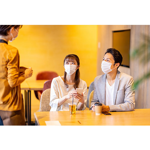 国や多くの地方自治体から、店内の飲食時にのみマスクを外し会話の際にはマスクを着ける新しい会食様式としてマスク会食が推奨され、その告知物として啓発ポスターや三角POPなどの素材が提供されています。