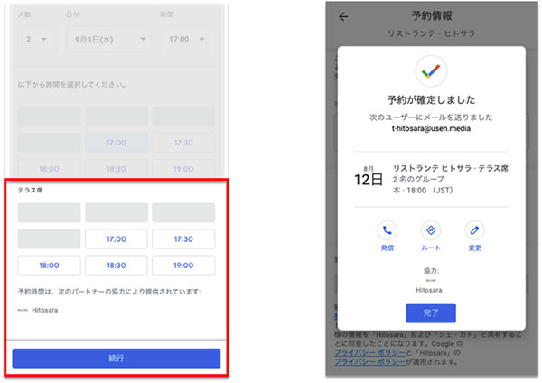 ヒトサラ、「Google で予約」でテラス席表示に対応
