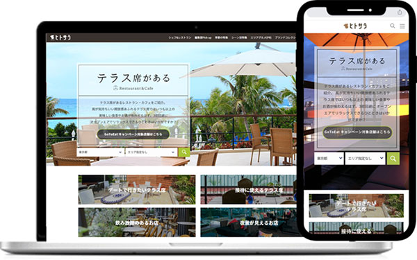 2020年9月にリニューアルし、いっそうコンテンツを強化した「ヒトサラ テラス席があるレストラン&カフェ特集」(https://hitosara.com/season/terrace/)では、「デートで行きたいテラス席」・「夜景が見えるお店」などロケーションに合わせたお店探しが可能です。