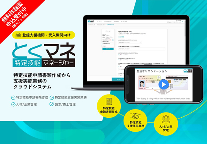 『とくマネ』は、「申請書類作成業務」「支援実施業務」「人材・企業管理業務」の3つの機能を兼ね備えた業界初※3の特定技能業務クラウドサービスです。登録支援機関や受入機関の業務負担を削減し、最小人員でより多くの申請・支援人数の運営ができるだけでなく、外国人にとって使い易くかつ充実した支援コンテンツの提供を可能にします。