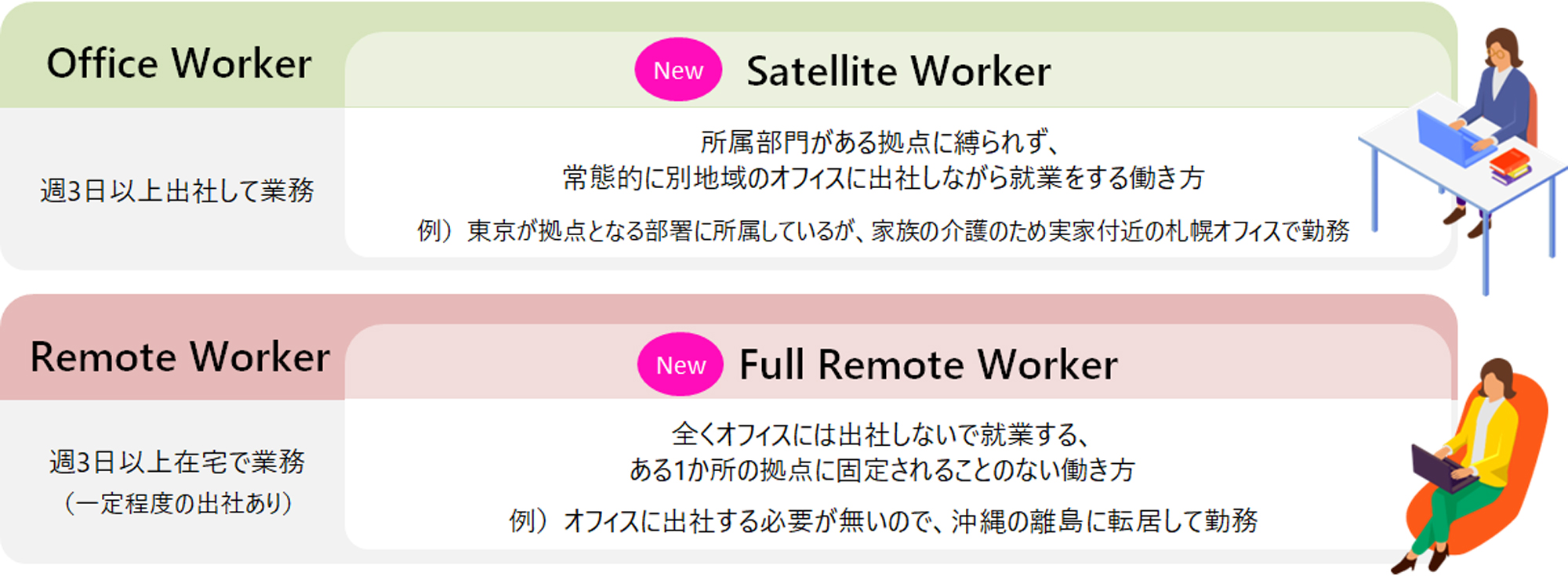 社員がより生産性高く、安心して長く働くことができる環境を構築するために、2022年9月より「Workers Location制度」を一部改定し、既存の「Office Worker」「Remote Worker」を細分化し、新たに「Satellite Worker」と「Full Remote Worker」という2つの枠組みを追加しました。