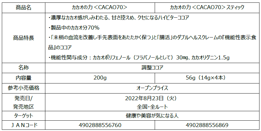 「カカオの力<CACAO70>」は、「血流改善(末梢の血流を改善し手先表面をあたたかく保つ)」と「腸活(カカオリグニンが、便通が気になる方のおなかの調子を整える)」のダブルヘルスクレームの『機能性表示食品』としてリニューアルして、2022年8月23日(火)より発売中です。