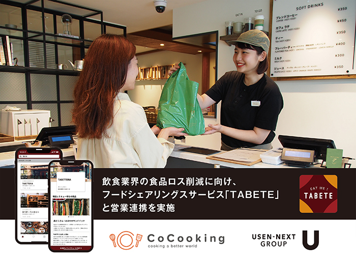 株式会社USEN-NEXT HOLDINGS(本社:東京都品川区、代表取締役社長CEO:宇野 康秀、以下、当社)は、飲食業界のSDGs推進・食品ロス削減に向け、2023年6月より、食品ロス削減のためのフードシェアリングサービス「TABETE」を運営する株式会社コークッキング(本社:埼玉県東松山市、代表取締役CEO:川越 一磨、以下、コークッキング)との営業連携を実施しており、同年9月より、当社グループからの紹介で飲食店のお客様に「TABETE」を導入いただくことになりました。「TABETE」は、おいしく安全に食べられるのに、店頭では売り切るのが難しい食事をお得に「購入(レスキュー)」できるプラットフォームです。
