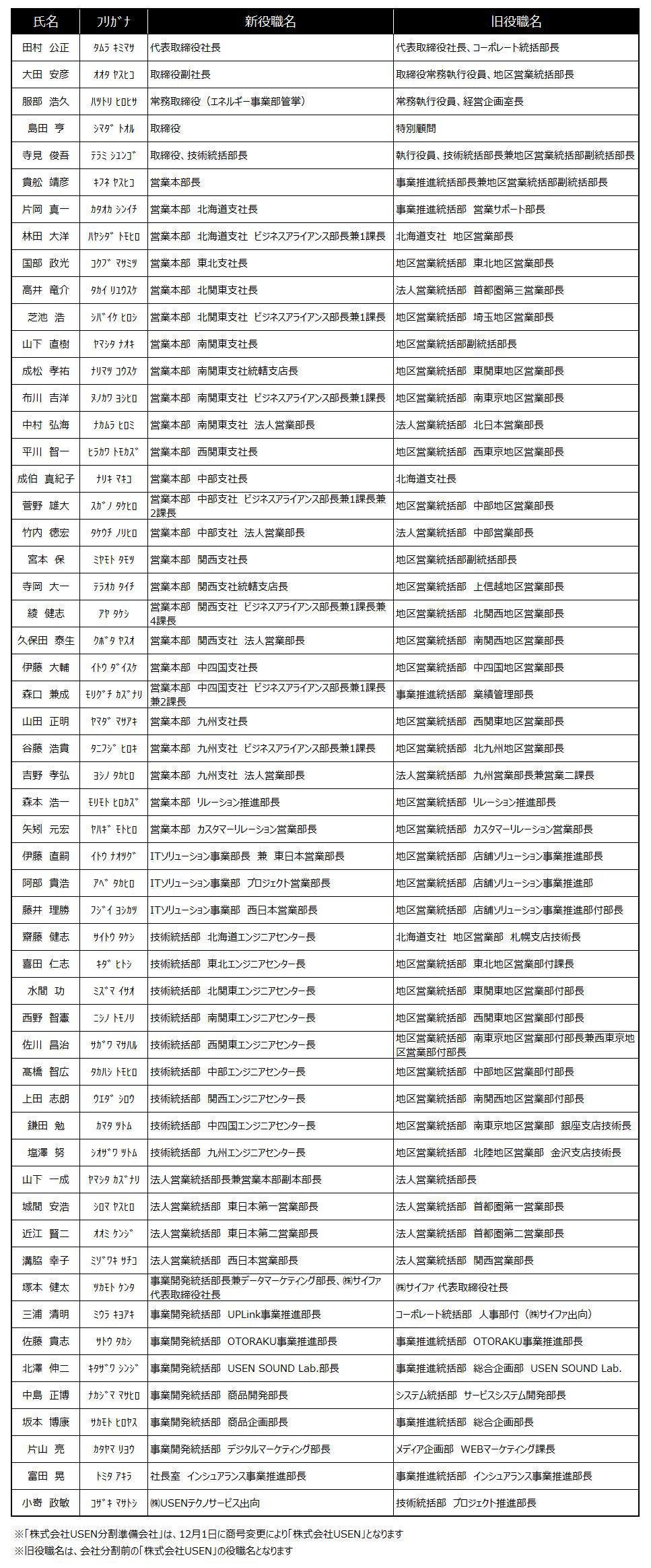 株式会社 USEN(本社:東京都港区、代表取締役社長:田村公正)は、平成29年12月1日付の人事異動を下記の通りお知らせします。