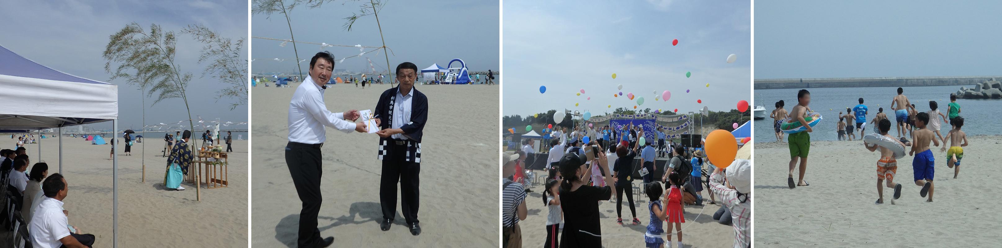 また、7月21日当日午前9時から安全祈願祭の神事が執り行われ、相馬市観光協会会長、相馬市長、市議会議員などの方々に並びUSENの代表者も参列し、復興を祈願、県内外に活性化をアピールし、安全な海水浴場の運営を願いました。