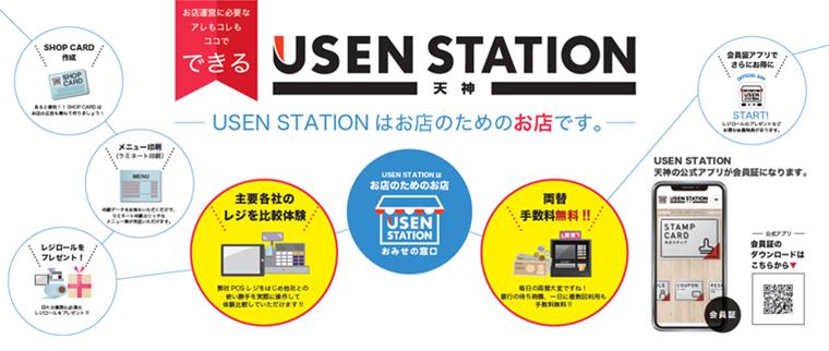 USENでは、近年、「音楽配信事業」に加えて、店舗のコンセプト設計から資金調達、物件・立地選定・集客・販売促進など、店舗経営を支援する「店舗総合支援サービス」を提供しています。本日、天神にオープンする『USEN STATION』は、“お店のためのお店”をコンセプトに、日頃の店舗運営に不可欠となるサービス(メニューやショップカードの制作、主要各社のレジの比較体験コーナー、手数料無料の両替機)から、集客に関する相談まで可能な場となります。