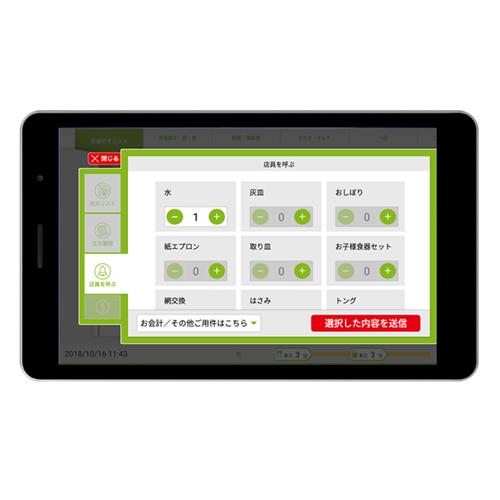 ◆呼び出し機能の高機能版であり、水やおしぼりなど用途と数量を選択し、店員呼び出しが可能