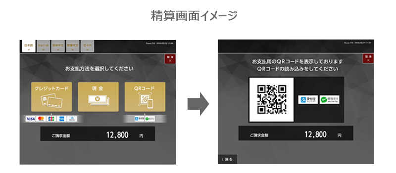 ・R&Bホテルでは、精算機でのチェックインがメインであるため、フロント側だけでなく、精算機側にモバイル決済可能な仕組みが
