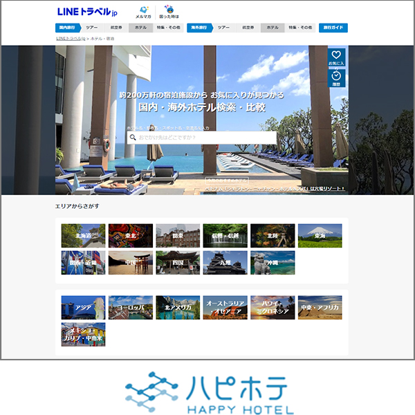 今回、更なるユーザーの獲得を推進するため、ハッピー・ホテルに掲載されている予約プラン(宿泊・休憩)の情報を「LINEトラベルjp」に掲載することを決定しました。国内事業者とのアライアンスは、楽天トラベルに次いで2社目となります。