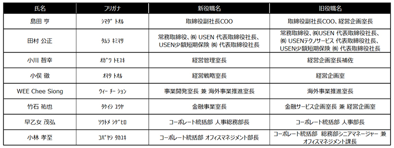 株式会社 USEN-NEXT HOLDINGS(本社:東京都品川区、代表取締役社長CEO:宇野 康秀)は9月1日、人事異動を行いましたので、下記のとおりお知らせします。