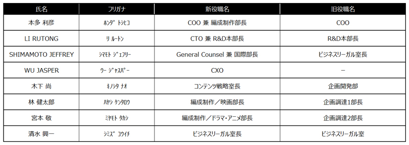 株式会社 USEN-NEXT HOLDINGS(本社:東京都品川区、代表取締役社長CEO:宇野 康秀)は10月1日、グループ会社である株式会社 U-NEXTの人事異動を行いましたので、下記のとおりお知らせします。