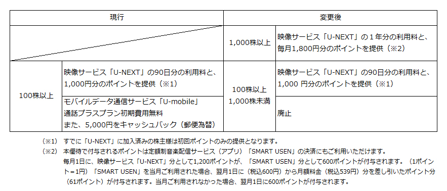 株式会社 USEN-NEXT HOLDINGS(本社:東京都品川区、代表取締役社長CEO:宇野 康秀)は本日開催の取締役会において、株主優待制度の内容を拡充することを決議いたしましたので、お知らせします。