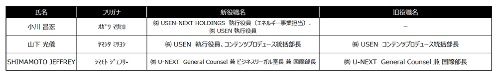 株式会社 USEN-NEXT HOLDINGS(本社:東京都品川区、代表取締役社長CEO:宇野 康秀)は12月1日、株式会社 USEN-NEXT HOLDINGS及びグループ会社である株式会社 USEN、株式会社 U-NEXTの人事異動を行いましたので、下記のとおりお知らせします。