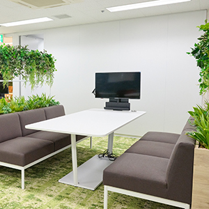 商談はもとより、ご来社されたお取引様のすきま時間などにも利用可能。新たな人と情報の交流を創出します。大きなモニターも設置し、プレゼンテーションやセミナー等にも活用できます。