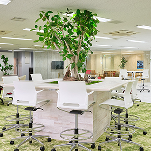 オフィス内には生木のグリーンを多数配置し、平和都市【広島】のように、ここで働く社員が心休まる空間で緑に囲まれながら植物の生命力を感じてイキイキと働けるよう、演出しました。