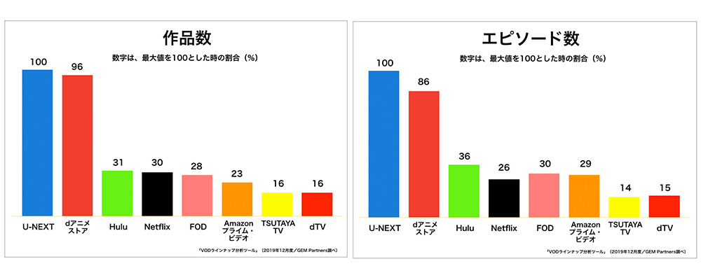 USEN-NEXT GROUPの株式会社 U-NEXT(本社:東京都品川区、 代表取締役社長:堤 天心)が運営する動画配信サービス「U-NEXT」は、 GEM Partners株式会社(ジェムパートナーズ、 所在地:東京都港区、 代表取締役:梅津 文)の2019年12月度の集計において、 主要動画配信サービスのなかで「アニメ見放題作品数No.1」を獲得いたしました。