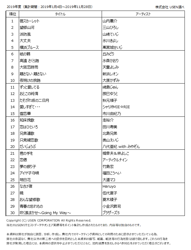 2019年間 USEN HIT 演歌/歌謡曲ランキング