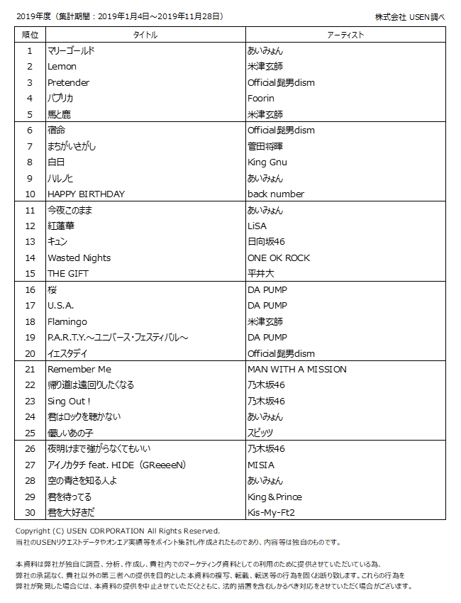 USEN-NEXT GROUPの株式会社 USEN(本社:東京都品川区、代表取締役社長:田村公正、以下:当社)は、運営するUSEN音楽放送(USEN440、SOUND PLANET、music AirBee!、SOUND PLANET-i)におけるオンエア実績や、リスナーからのリクエストを基に独自に集計した『2019 年間 USEN HIT ランキング』を、本日発表いたしました。初めてのカウントダウンムービーも期間限定で、公開します。2019年、日本全国の街に流れ、今年1年皆様から愛され流行したヒット曲のランキングとなりますので、ぜひご注目ください。