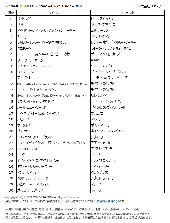 2019 年間 USEN HIT J-POPランキング、洋楽ランキング、演歌/歌謡曲ランキング