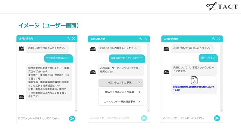 USEN-NEXT GROUPの株式会社 TACT(本店:東京都品川区、代表取締役社長:溝辺 和広、以下、当社)は、AIエンジンによる自然言語処理を用いた新たな自動応答チャットボットサービス『AIコンシェルジュ for チャットボット(以下、AICチャットボット)』を本日、1月15日より提供開始します。『AICチャットボット』は、「AIコンシェルジュ®」の対話エンジンを用いたAIが、ユーザーからの問い合わせに適切な回答を自動応答し、高品質な会話を実現します。