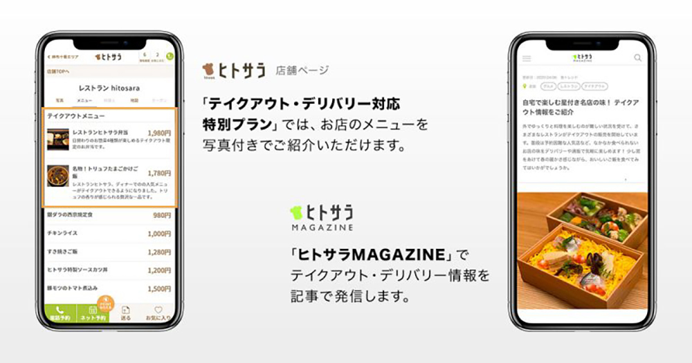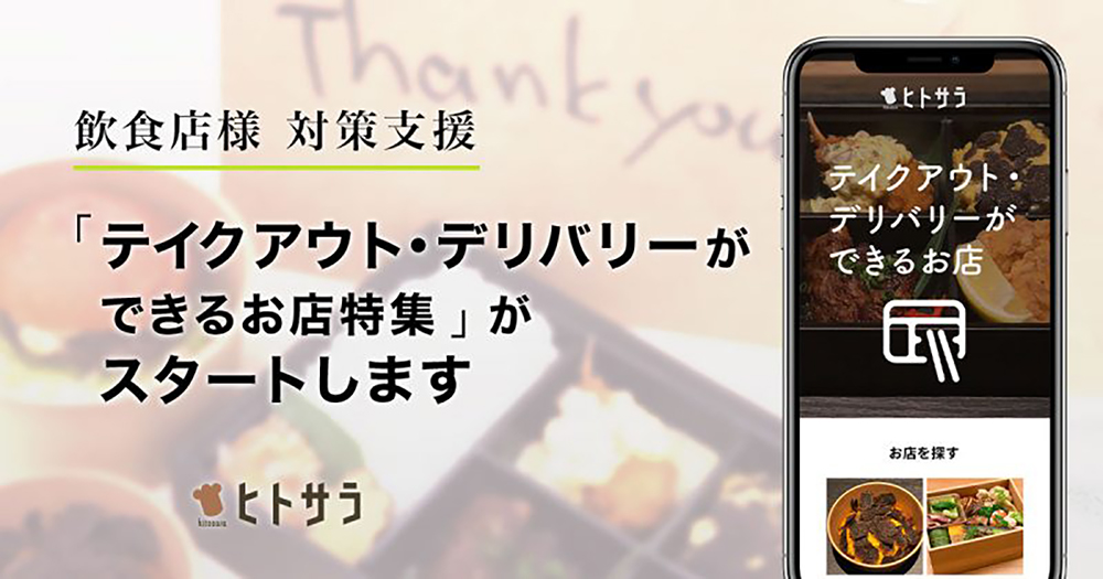 こうした取り組みの輪の中で、『ヒトサラ』は少しでも飲食店のお役に立ちたいという思いから、お店の取り組みをより多くのユーザーに知っていただくため、店舗の衛生対策表示の開始に続き「テイクアウト・デリバリーができるお店特集」を新たに立ち上げ、加盟店様のみならず全国の飲食店様にも無料で参加いただける特別枠を提供します。