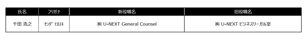 株式会社 USEN-NEXT HOLDINGS(本社:東京都品川区、代表取締役社長CEO:宇野 康秀)は5月1日、グループ会社である株式会社 U-NEXTの人事異動を行いましたので、下記のとおりお知らせします。