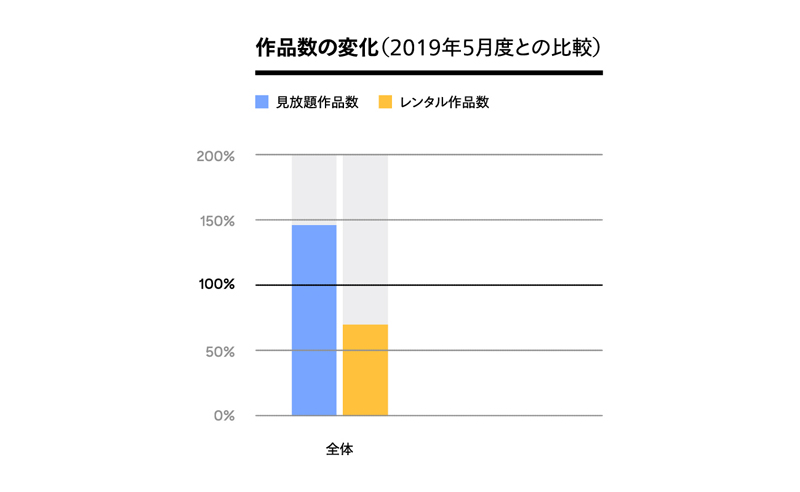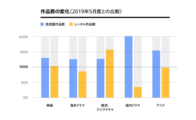 動画の配信本数は、前年同期比131%の20万本を突破。見放題作品数は、同146%の18万本に到達しました。