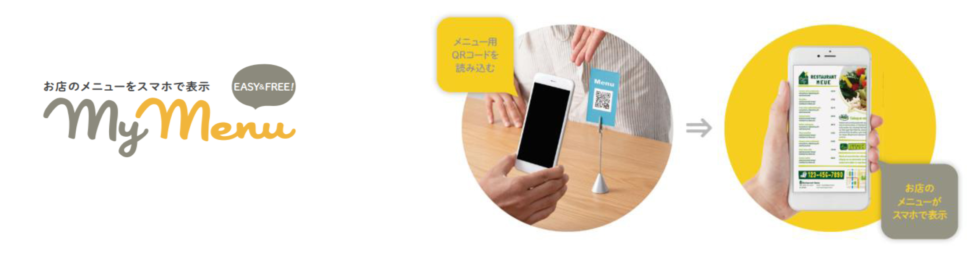 コロナウイルス感染症の影響により、あらゆるシーンにおいて衛生対策が行われていますが、飲食店のメニューブックを触ることに抵抗を 感じるという方もいらっしゃいます。『USEN My Menu』は、メニューを電子化してQRコードを生成、飲食店にて QRをポップやシール に印字してテーブルに配置することで、QRを読み取った来店客のスマートフォンにメニューを表示することができるサービスです。 『USEN My Menu』を無料提供することで、より安心できるお店づくりを支援いたします。
