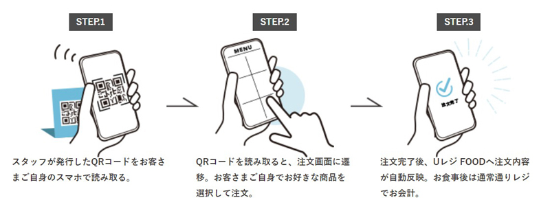 『Uレジ Mobile Order』は、指定のQRを読み込めばお客様のスマートフォンから直接注文ができるサービスです。これにより、混雑時のお客様の待ち時間を削減し、さらに注文受付業務を簡略化できるため、店舗の人手不足解消や人員の最適化を図ることが可能となります。