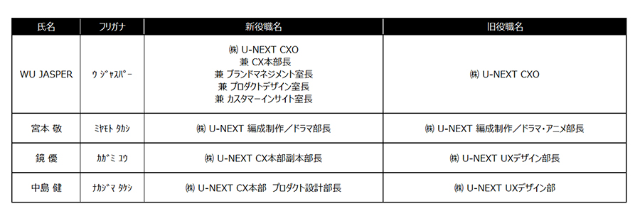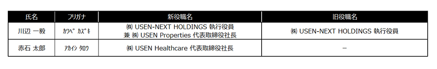 株式会社 USEN-NEXT HOLDINGS(本社:東京都品川区、代表取締役社長CEO:宇野 康秀、以下、当社)は 7月1日、当社とグループ会社である株式会社 U-NEXTの人事異動を行いましたので、下記のとおりお知らせします。