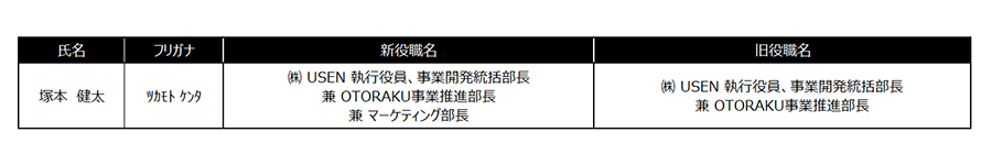 株式会社 USEN-NEXT HOLDINGS(本社:東京都品川区、代表取締役社長CEO:宇野 康秀)は8月1日、グループ会社である株式会社 USENの人事異動を行いましたので、下記のとおりお知らせします。