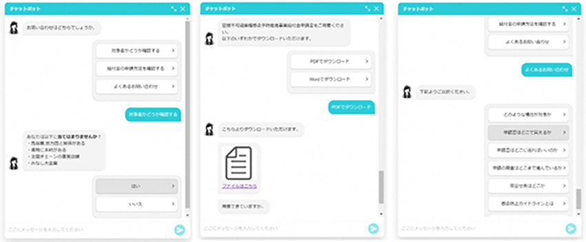 今回、愛媛県・密接不可避給付金の問い合わせ受付では、申請者の方がチャット画面から質問項目を選択すると、申請対象者かのチェックや、申請に必要な書類を1つずつ確認、Word・PDFでダウンロードすることができるようになっています。