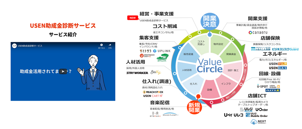 今回のサービス開始にあたり、本分野で実績豊富なライトアップ社と業務提携を締結することでUSENは、お店の状況を確認し、事前に受給可能な助成金を診断する役割を担えることになります。