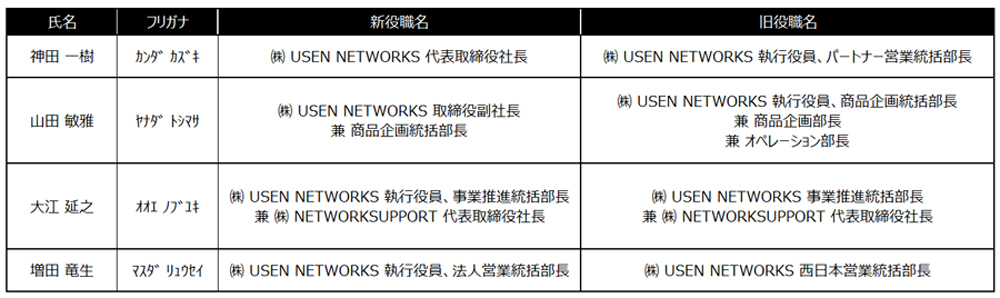 USEN-NEXT GROUP の株式会社 USEN NETWORKS(本店:東京都品川区、代表取締役社長:神田 一樹)は、本日 9月1日、下記のとおり人事を決定しましたのでお知らせします。