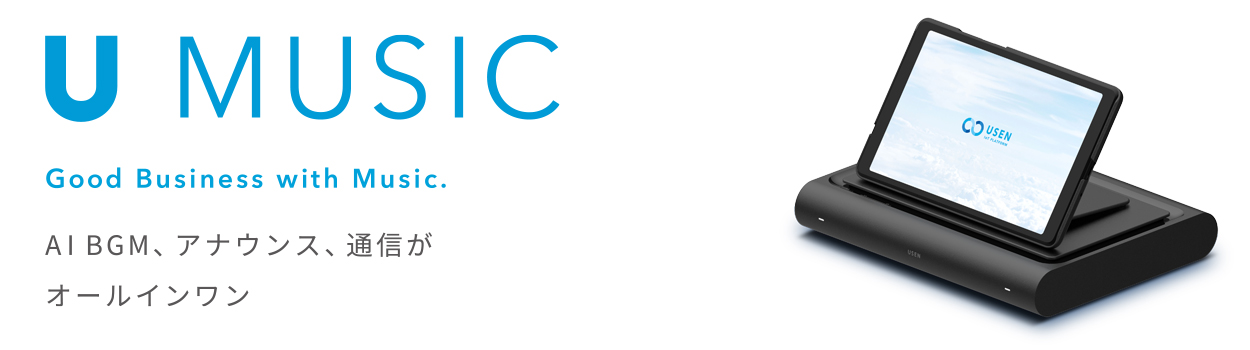 AI BGM『U MUSIC』は、申し込み時に入力した店舗情報をもとにプログラムやAIチャンネルを自動作成します。店舗の空間を彩る1,000ch以上のプロユース向けBGMチャンネルと、店内オペレーションの課題を音で解決してくれるアナウンスも標準搭載しており、季節や時間帯、天気などの情報からAIが店舗の演出に合わせたBGMを自動で編成します。また、BGMプレイヤーの中に無線通信ルータを内蔵し、インターネット、Wi-Fi、BGM、アナウンス再生がこの1台でまかなえる、これからの店舗運営の必需品です。