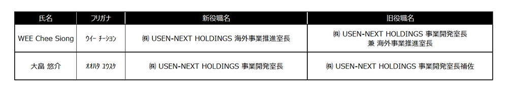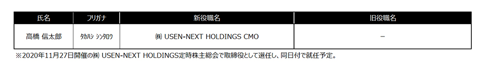 株式会社 USEN-NEXT HOLDINGS(本社:東京都品川区、代表取締役社長CEO:宇野 康秀、以下、当社)は本日10月1日、当社の人事を決定しましたので、下記のとおりお知らせします。