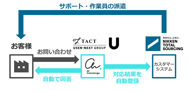 USEN-NEXT GROUPの株式会社 TACT(本店:東京都品川区、代表取締役社長:溝辺 和広、以下、当社)は、日研トータルソーシング株式会社(本社:東京都大田区、代表取締役社長:清水 浩二、以下、日研トータルソーシング)へ音声認識による電話自動応答サービス『AIコンシェルジュ®』を提供しました。日研トータルソーシングは、11月からロボティクス事業部のカスタマー向けテクニカルサポートの自動受付を開始しました。