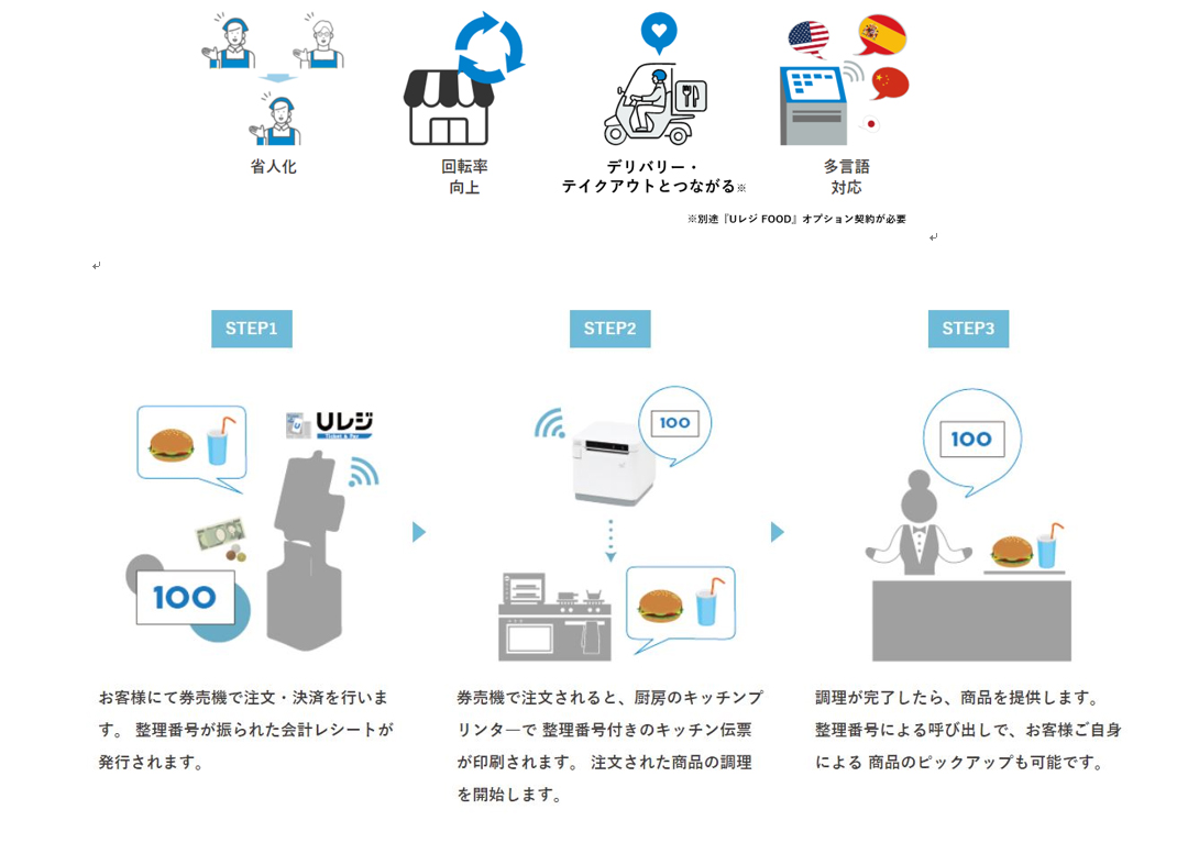 これにより『Uレジ FOOD』は、ラーメン・食堂・ファストフードといった、カウンターメインまたはセルフキャリ―(※お客様自ら料理を提供口へ取りに行く)業態で多く導入されている券売機による注文・決済に対応、さらにはコロナ禍の衛生対策として求められている決済時の非接触化を実現し、省人化による生産性向上にも寄与します。